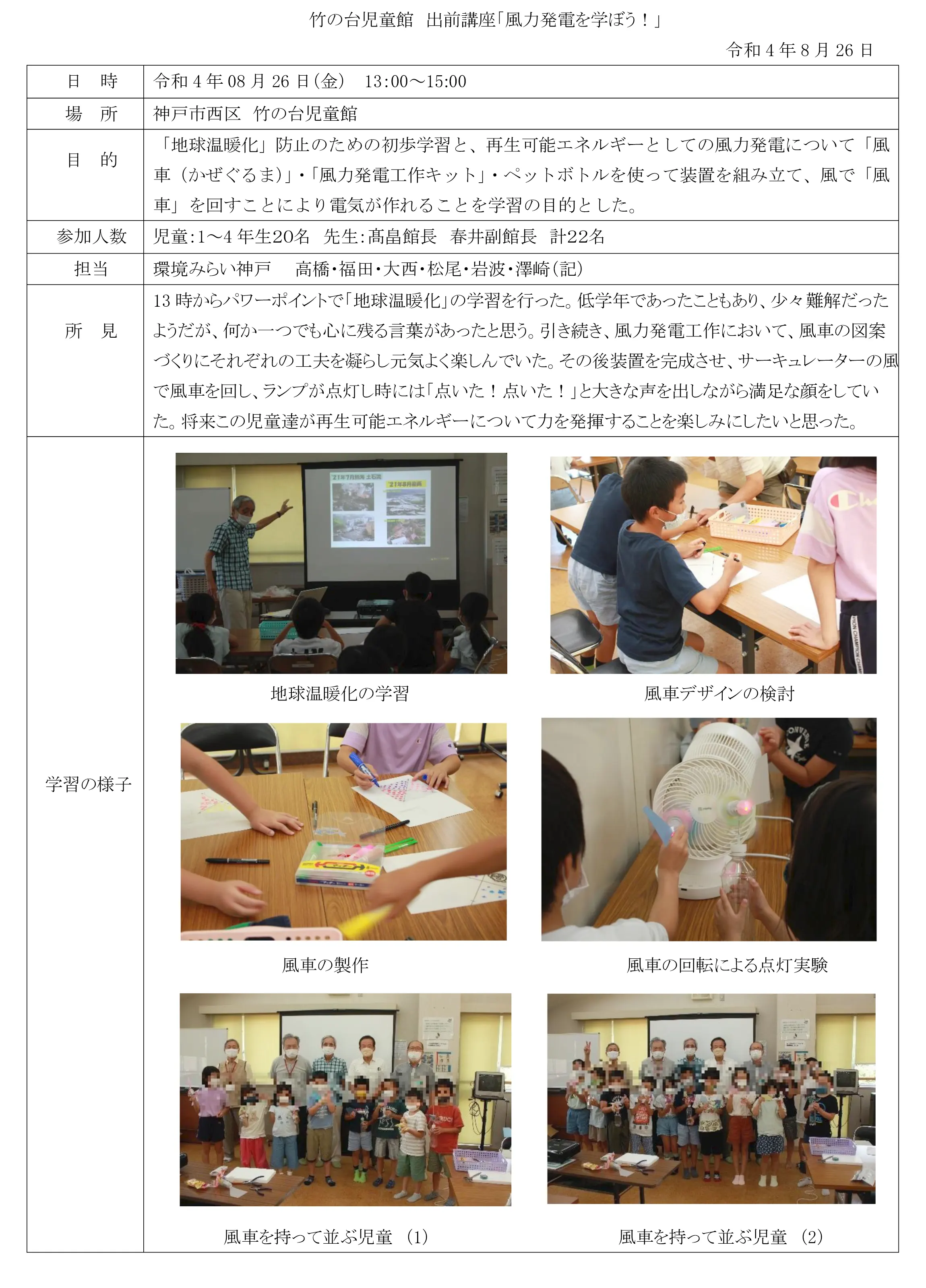 2022.08.26 開催の状況報告 竹の台児童館「風力発電を学ぼう!」