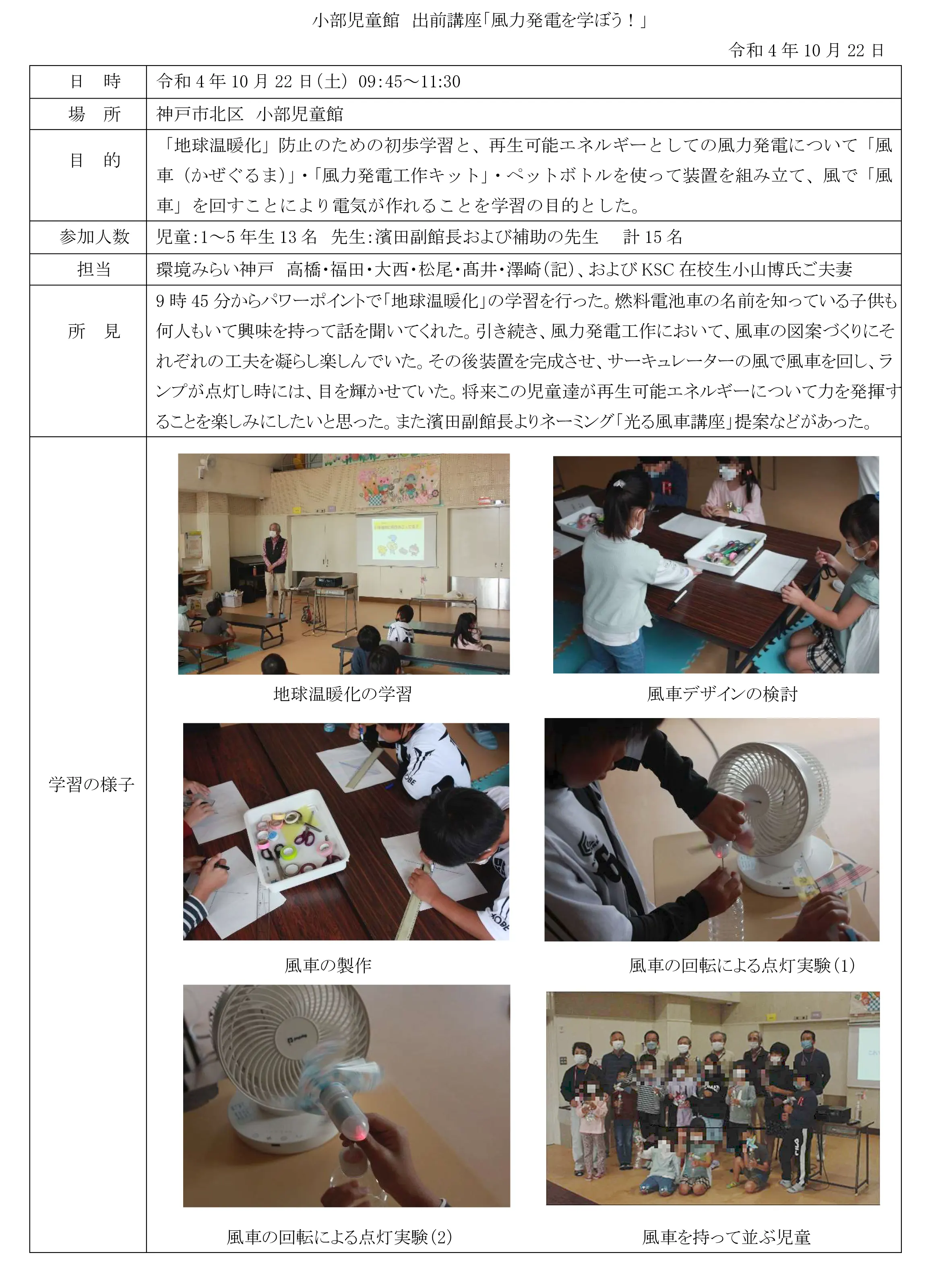 2022.10.22 開催の状況報告 小部児童館「風力発電を学ぼう!」