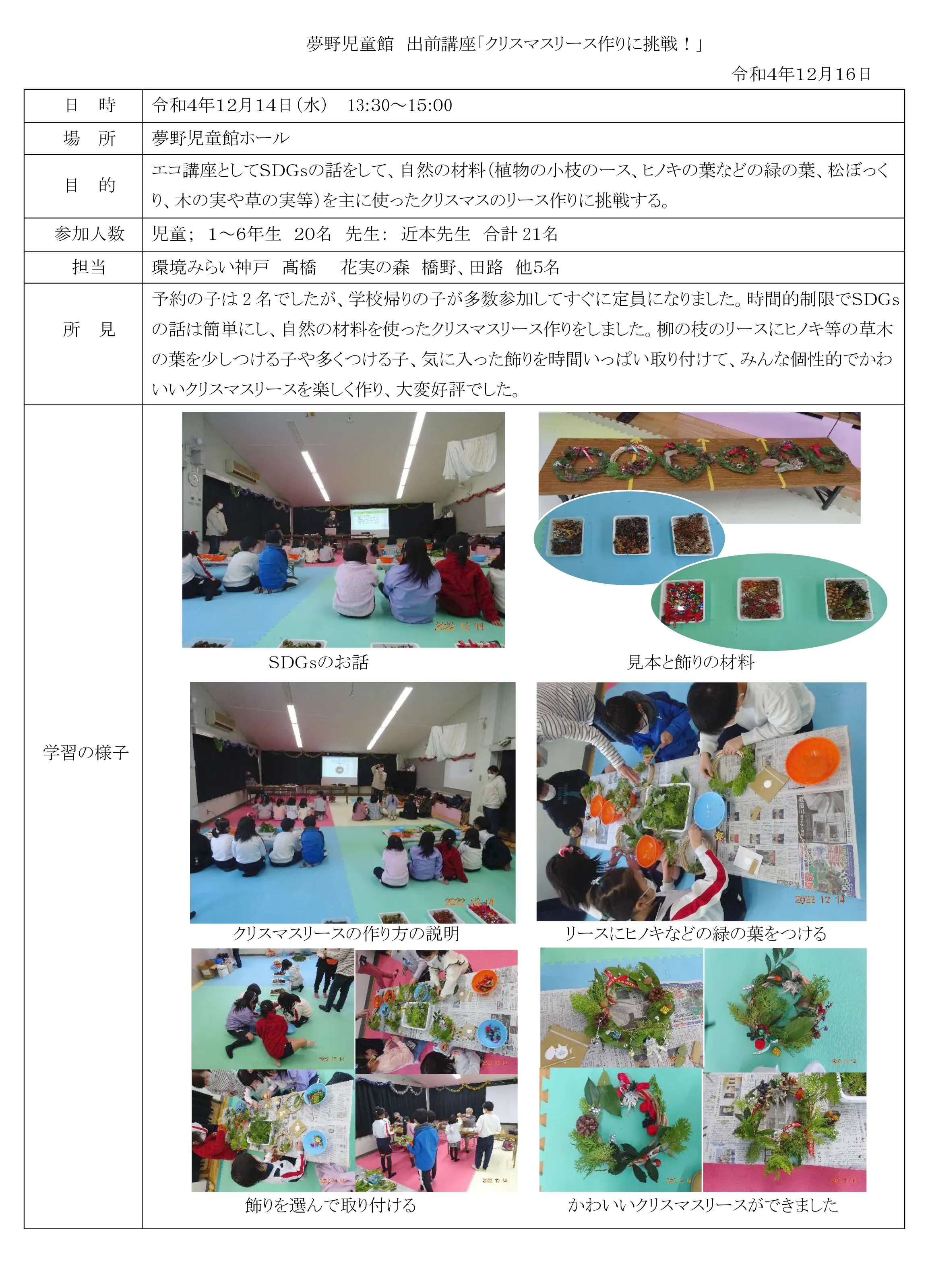 2022.11.26 開催の状況報告 霞ヶ丘児童館「クリスマスリース作りに挑戦!」