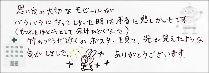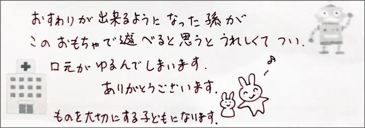 11月にお預かりした、おもちゃ返却の際に頂きましたメーッセージです!! とても喜んでいただき活動への励みになります、本当ににありがとうございます。